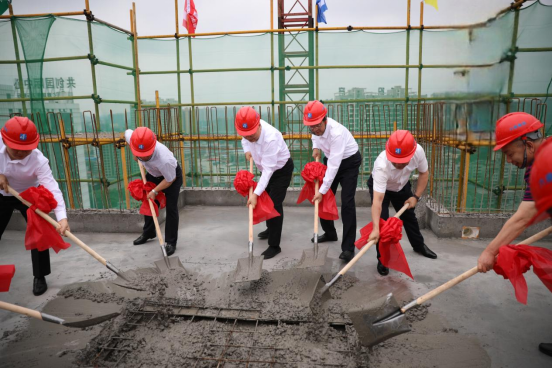 参与仪式的领导一起前往3号楼楼顶,共同浇筑最后一方混凝土,完成封顶仪式。